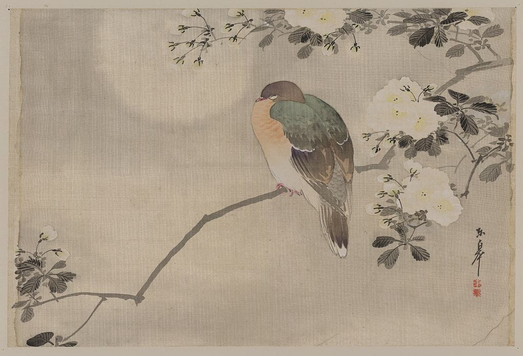 This month’s feature art includes “Bird perched on a branch of a blossoming tree,” an 18th century print by an unknown artist, housed within the Library of Congress’ Noyes collection. This piece was likely created during Japan’s Edo period (1615-1868) of self-imposed isolation. With fewer external influences, many Japanese artists explored and refined traditional art styles such as painting and woodblock prints in a style called Ukiyo-e (“pictures of the floating world”).