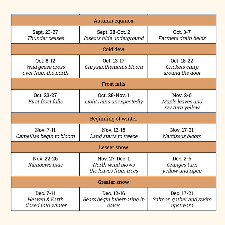 Compared to the original calendar, you may find that some seasons do sync up! Personally, I cannot wait for mid-October when “crickets chirp around the door.” Because even at different latitudes, some things really don’t change.