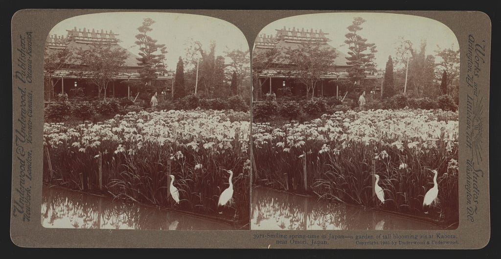 Lastly featured is “Smiling spring-time in Japan—a garden of tall blooming iris at Kabota, near Omari, Japan,” a stenograph by Underwood & Underwood printed in 1905. When viewed through a stereoscope, the double images created a 3D illusion for the viewer. These cards were commonly collected by tourists as souvenirs.