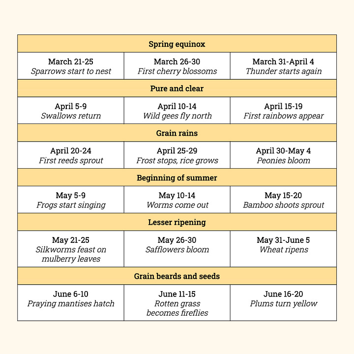 A new so-called “microseason” emerged every five days, quietly announcing the smallest changes. Eventually, the gently warming spring days will slid into early summer, marked by “praying mantises hatch” in early June. While equinoxes and solstices are noted, the Shichijuni-kō created a cadence of smaller moments to recognize, as opposed to the four simple astrological waypoints much of the world marks today.