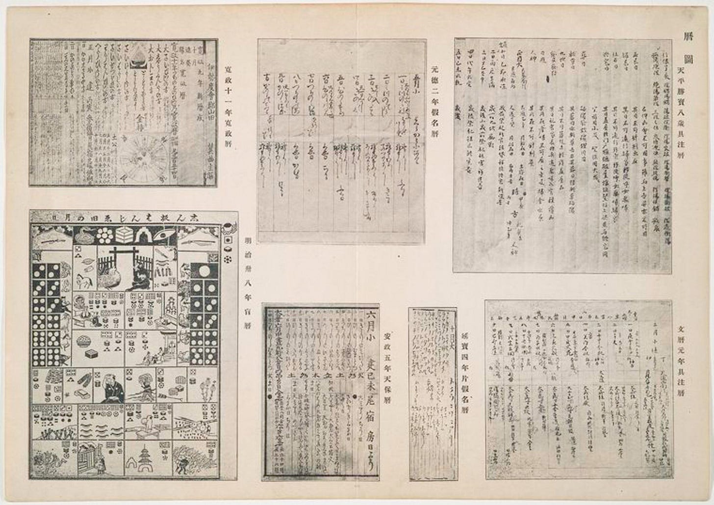“Various old Japanese calendars” (compiled 1908) comes from the New York Public Library’s Kokushi daijiten collection. With approximately 54,000 entries spanning history, art, folklore, language, and other cultural facets, the Kokushi daijiten is one of the largest encyclopedias of Japanese history. The original six-volume tome was compiled over two decades and first published in 1927.