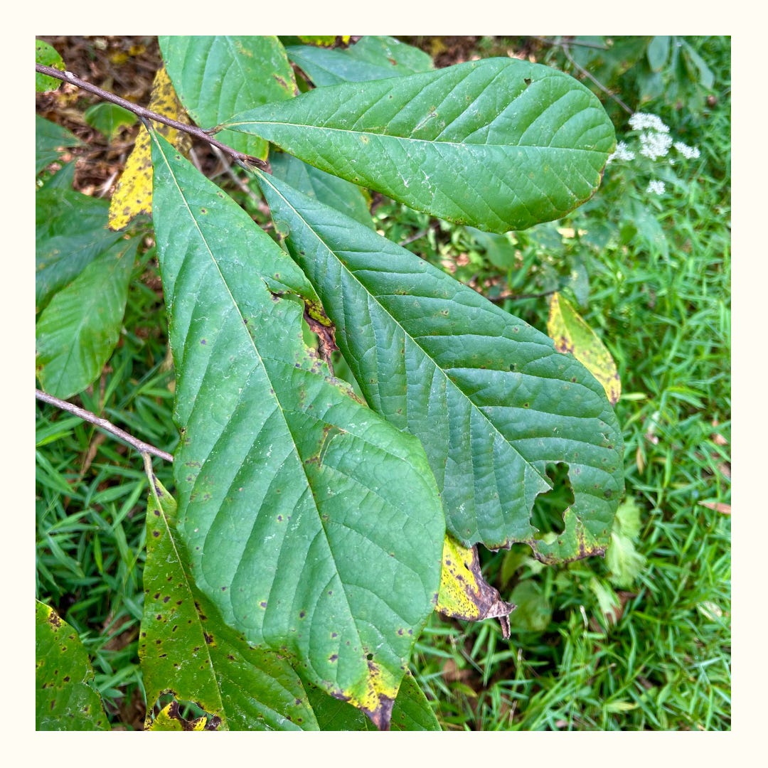 Where I’m at in Eastern Missouri, pawpaws are plentiful (after all, they are the state’s official fruit), though their range stretches to the East Coast, topping out into lower parts of Canada and bottoming out in parts of the Sun Belt. If you’re within this region, be on the watch for 20-30 foot trees along creek sides and river bottoms, or spots with particularly moist soil. Pawpaw trees are often found bunched together in groves and can be identified by their massive oval-shaped leaves, between 6 and 12 inches long and up to 5 inches wide. As fall progresses, they’ll transition from a deep green to yellow, and stay on the tree until nearly winter.